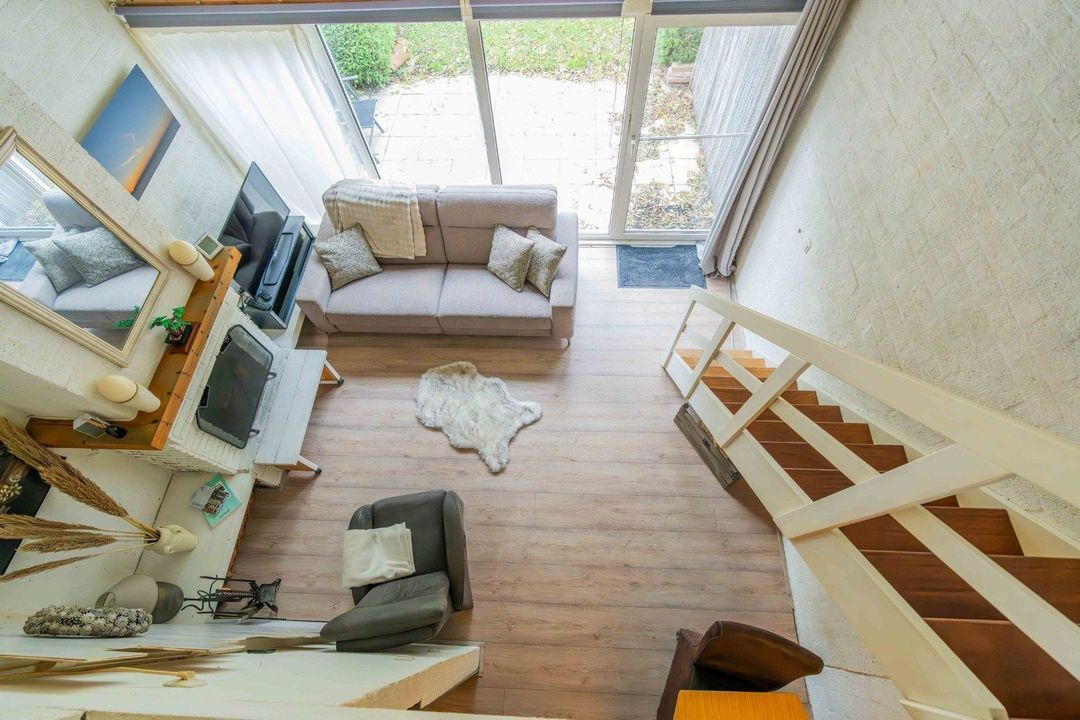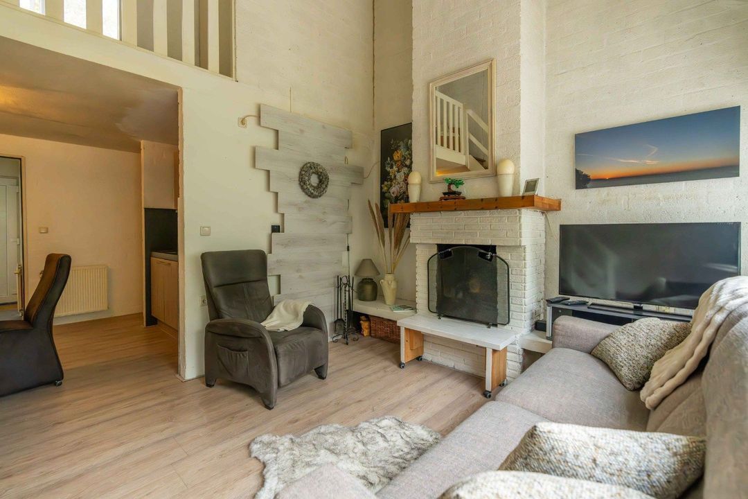 De woonkamer heeft veel lichtinval en een open haard voor extra sfeer. Via de achterdeur is er direct toegang tot de zonnige tuin.