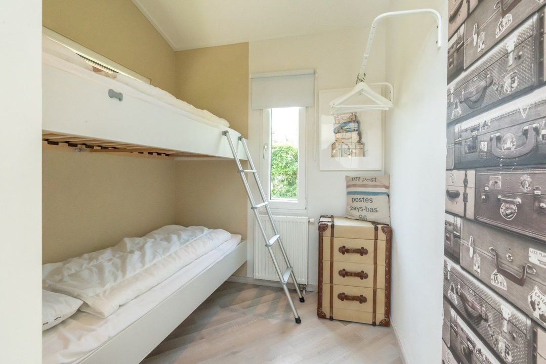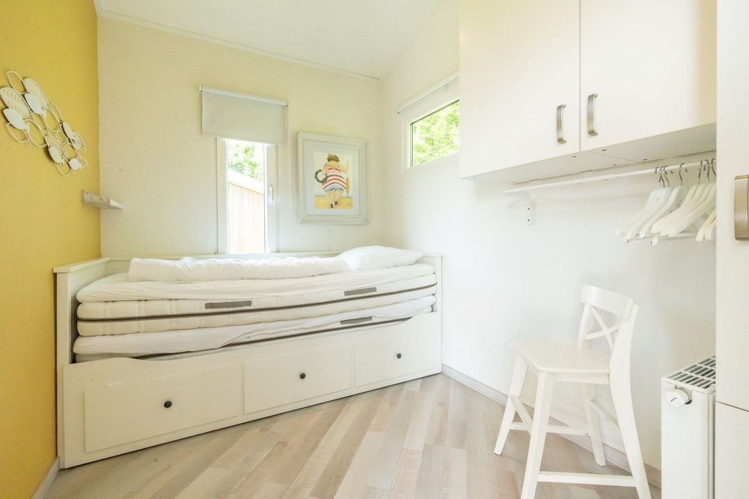 - Aan de linkerkant van het chalet vind je 2 slaapkamers: één met een stapelbed en de andere met een uitschuifbed. Beide kamers hebben opbergruimte en verwarming.