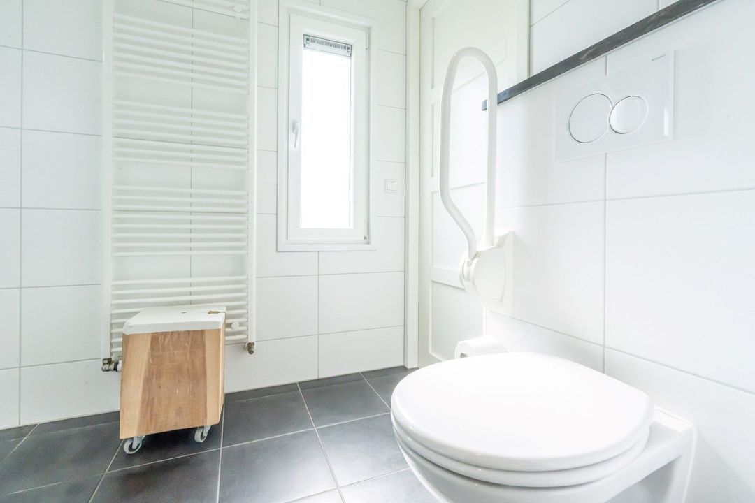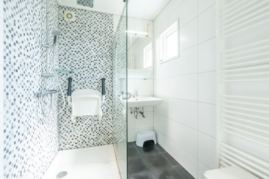 - De badkamer heeft een moderne inloopdouche, een wastafelmeubel en een toilet.