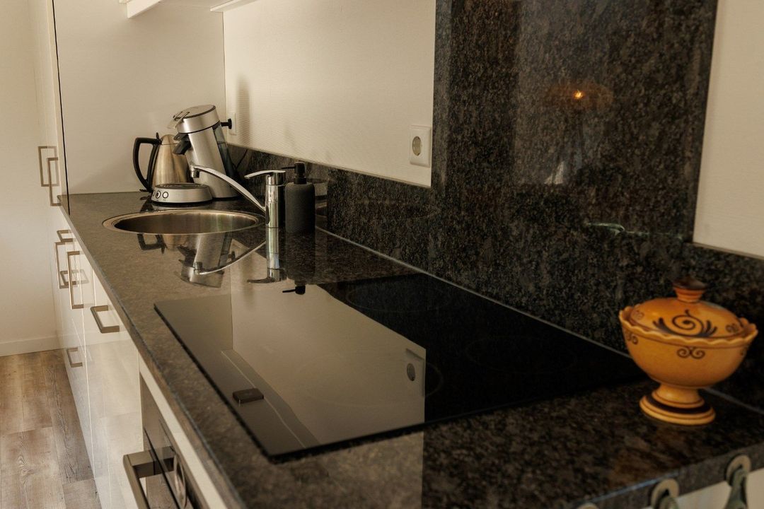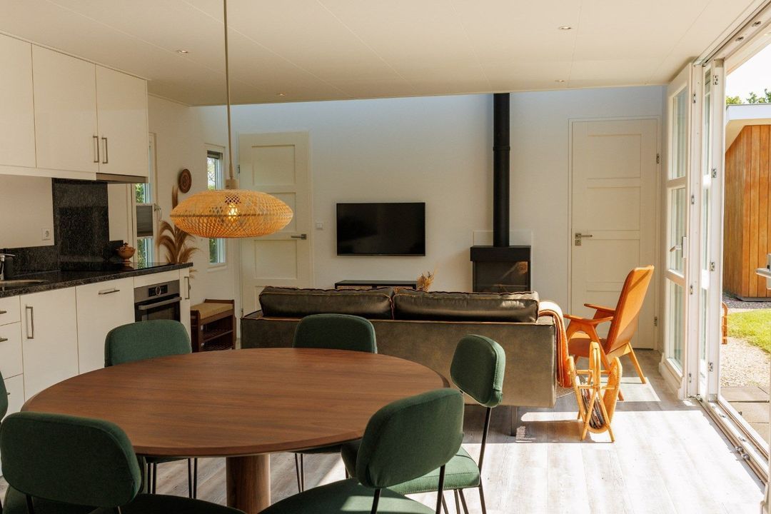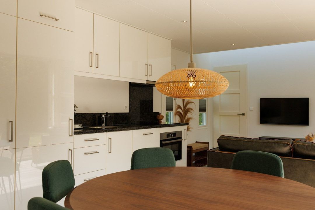 - Open keuken met 4-pits inductiekookplaat, afzuigkap, vaatwasser, combimagnetron, koelkast en vriezer.