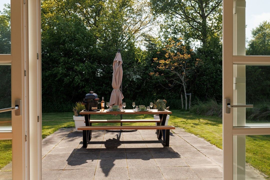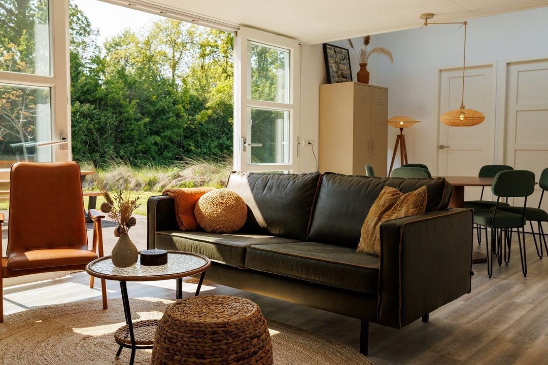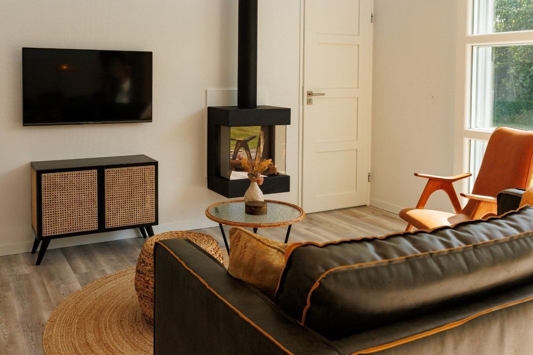 - Centraal ligt de woonkamer met gashaard en grote tuingerichte pui; binnen en buiten lopen naadloos in elkaar over. De pui kan worden gesloten met louvreluiken.