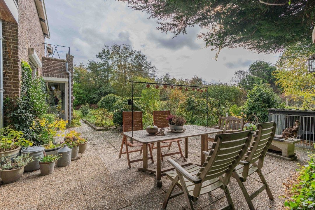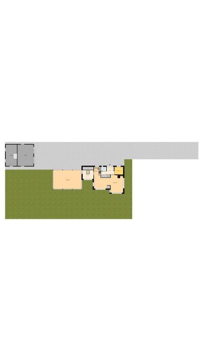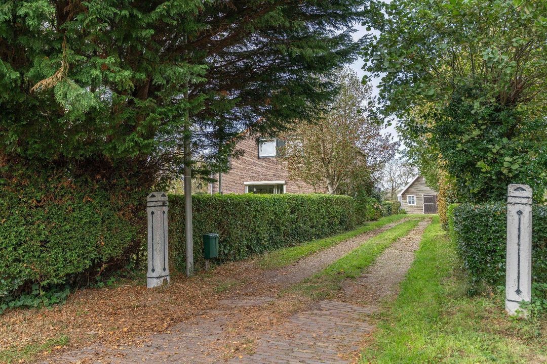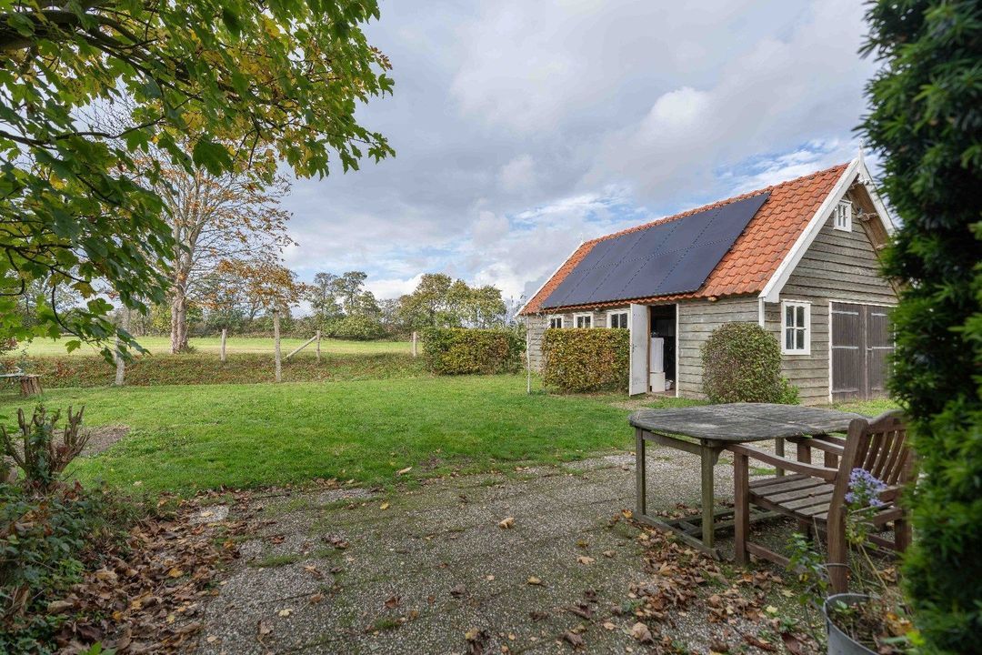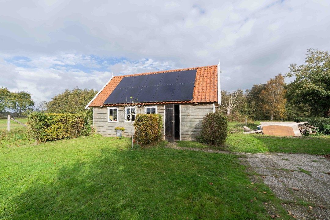 Oprit, woning, royale tuinkamer, vrijstaande schuur met zonnepanelen, tuin, erf en ondergrond.