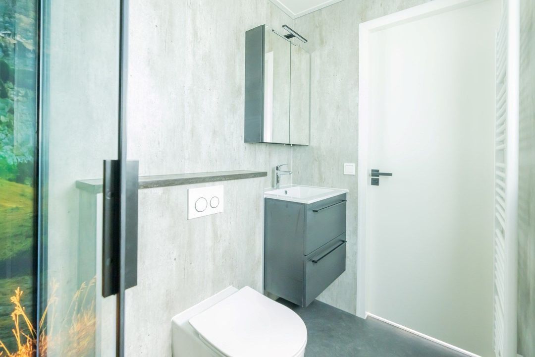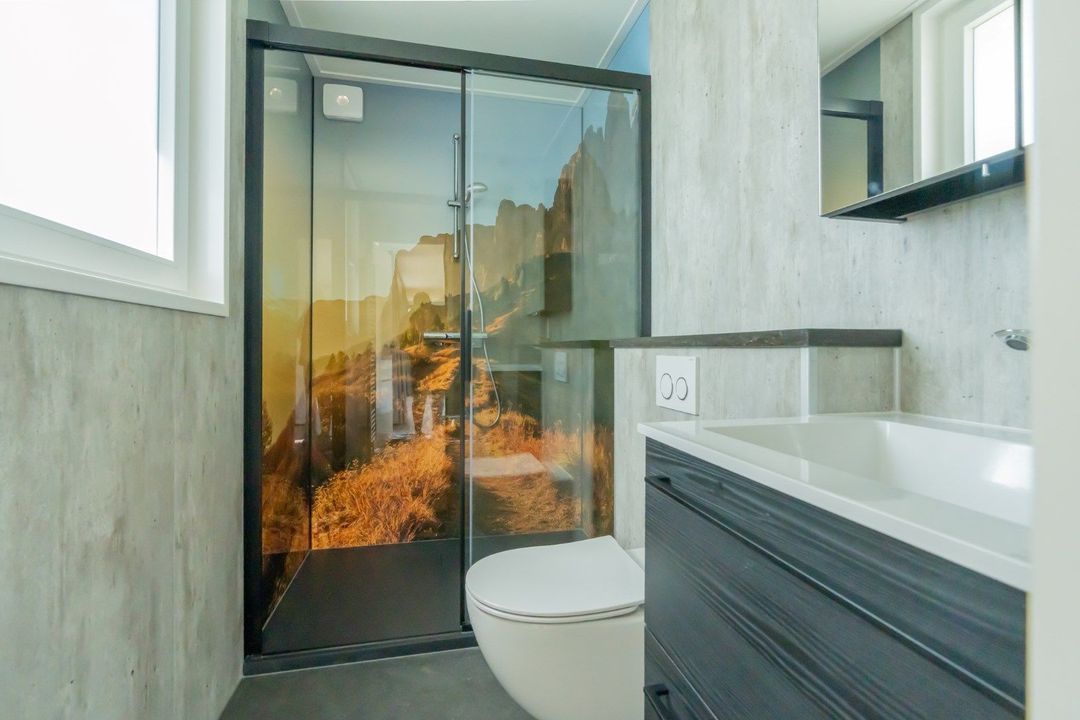 - De badkamer is uniek met een prachtige glazen fotoprint. Uiteraard beschikt het een ruime douchecabine, toilet, wastafelmeubel met spiegelkast en designradiator.