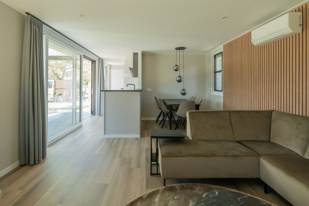 - De ruime woonkamer is ingericht met een comfortabele hoekbank, stijlvolle salontafel en luxe fauteuils. De ramen kunnen worden verduisterd middels jaloezieën. De airconditioning in de woonkamer geeft de controle over de kamertemperatuur zodat u in iedere omstandigheid kunt genieten van de gewenste temperatuur heel het jaar door.