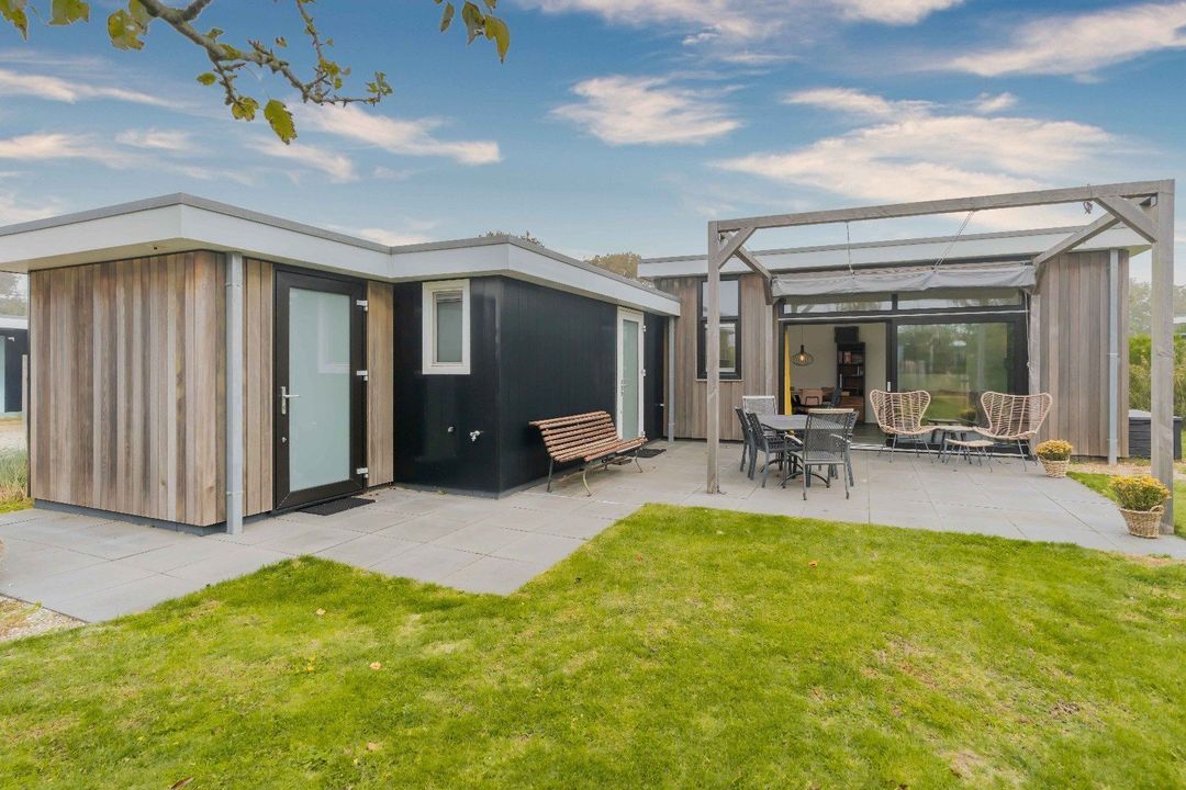 - 75m2 L-vormig chalet inclusief berging (buitenmaten), met terrasoverkapping
