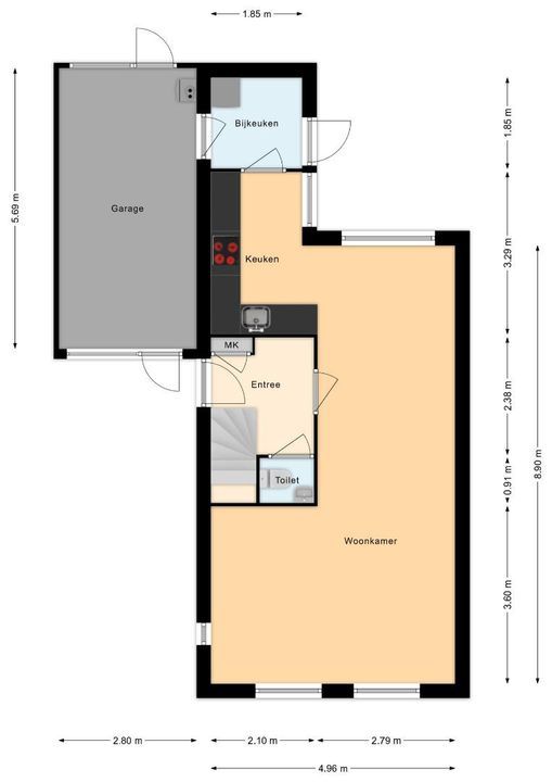 * woonkamer aan de voorzijde, keuken aan de tuinzijde