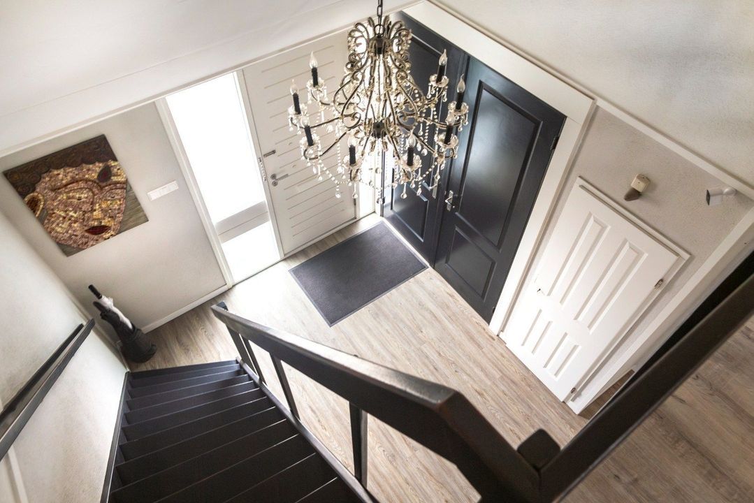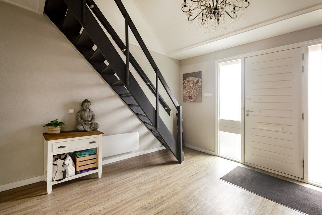 - De woning verwelkomt u met een royale entreehal met vide, groots van formaat; hier vindt u garderobe kasten, de meterkast, een apart toilet, toegang tot de slaapkamer en de woonkeuken