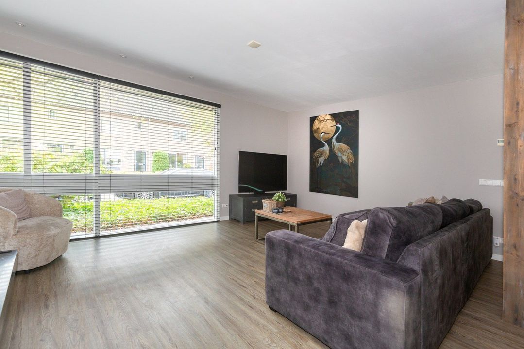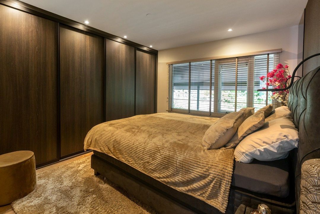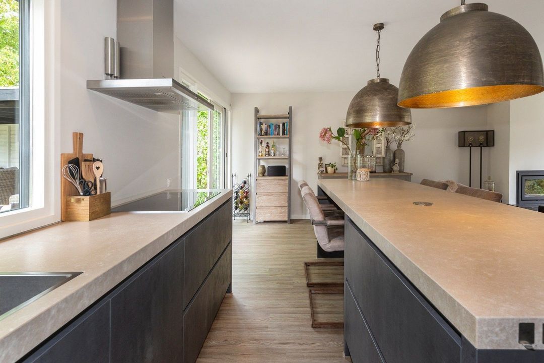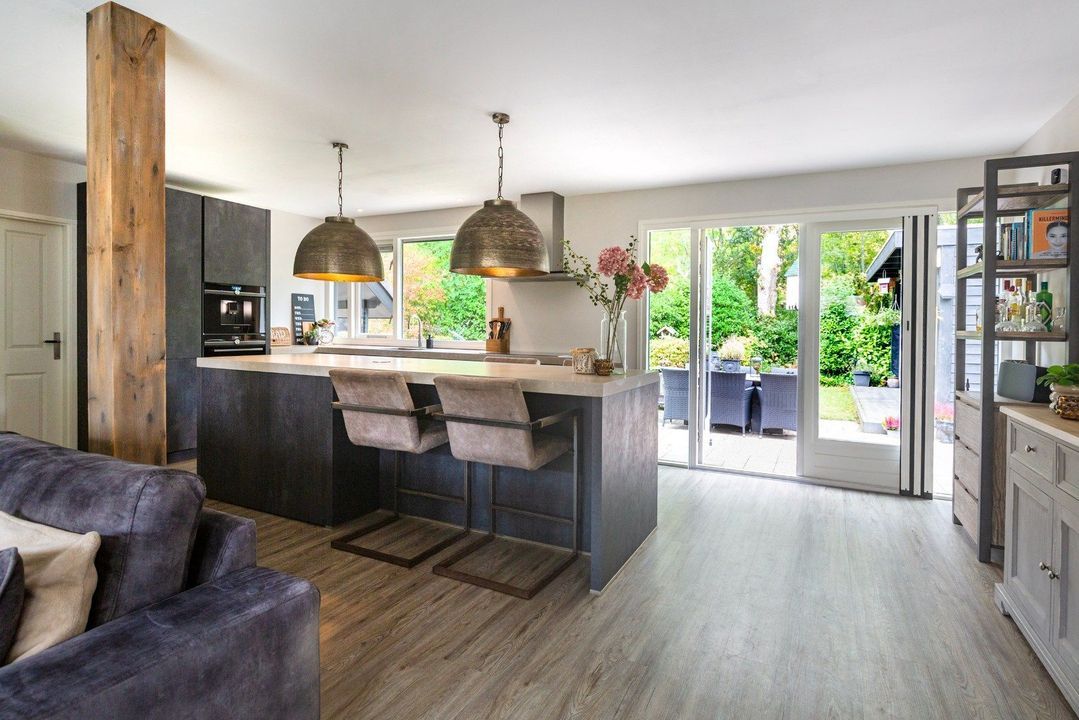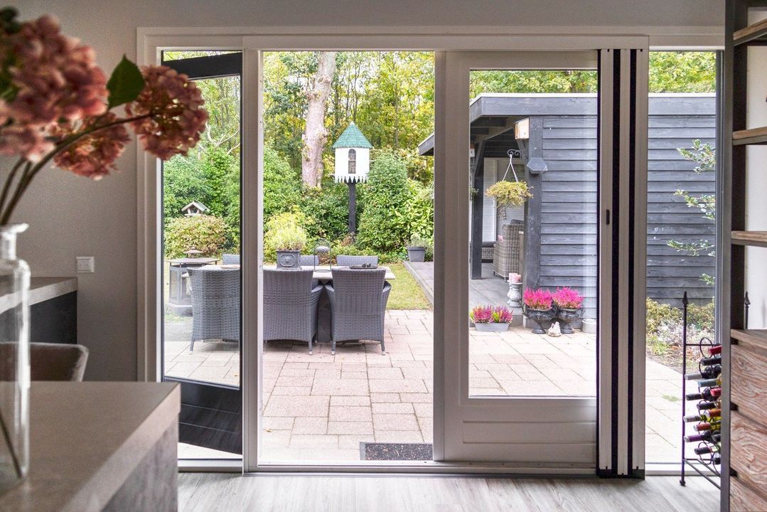 - Ruime living met hoge glazen pui van vloer tot plafond, houtkachel en openslaande deuren naar de tuin; er is ook airconditioning aanwezig
