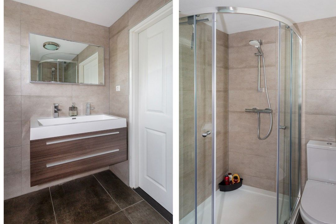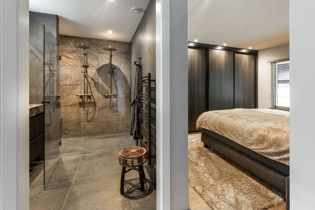 - Ruime slaapkamer op de begane grond met luxe badkamer en suite, schuifkasten van vloer tot plafond (een zee aan opbergruimte) met inbouwspots, dubbele regendouche en dubbele op maatgemaakte keramische wastafel; de extra ruimte wordt nu gebruikt als werkkamer