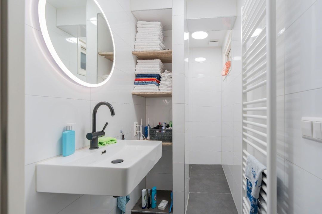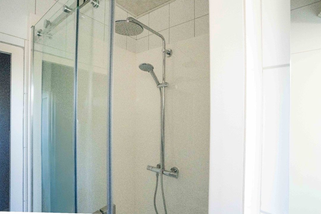 - Op de begane grond ligt een strakke plavuizenvloer en is volledig drempelvrij. Via een loftdeur bereikt u de slaapkamer, die desgewenst ook bij de woonkamer kan worden betrokken. Daarnaast bevindt zich hier de woonkamer met een keuken in hoekopstelling, voorzien van twee groepen voor elektrisch koken.