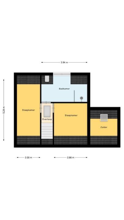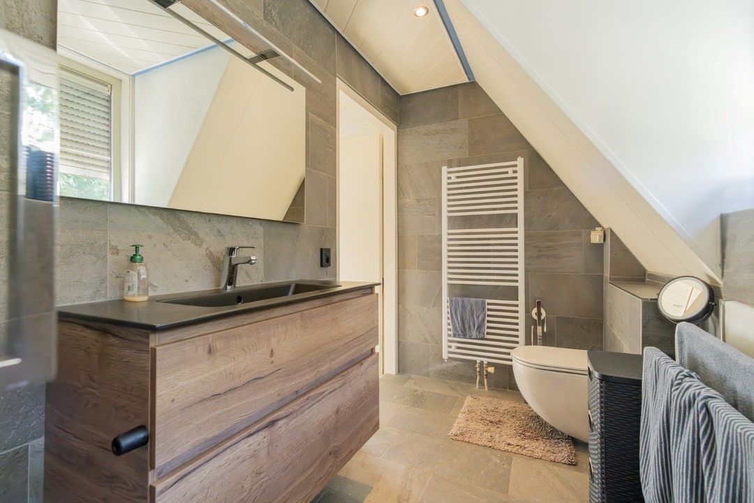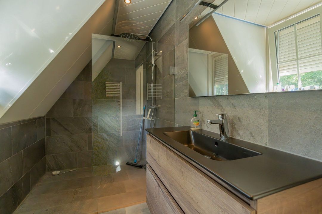 - Badkamer met dakkapel, inloopdouche, modern badmeubel, toilet, designradiator én rolluik