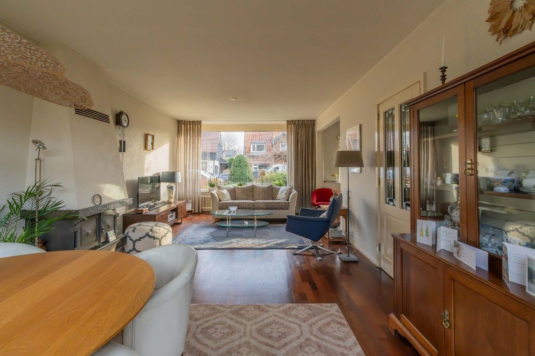 De woning beschikt over een royale U-vormige woonkamer met verschillende zithoeken en veel raampartijen, wat zorgt voor een prettige lichtinval. De open haard vormt het warme hart van het huis en draagt bij aan een gezellige sfeer. De fraaie houten vloeren versterken het karakter van de woning.