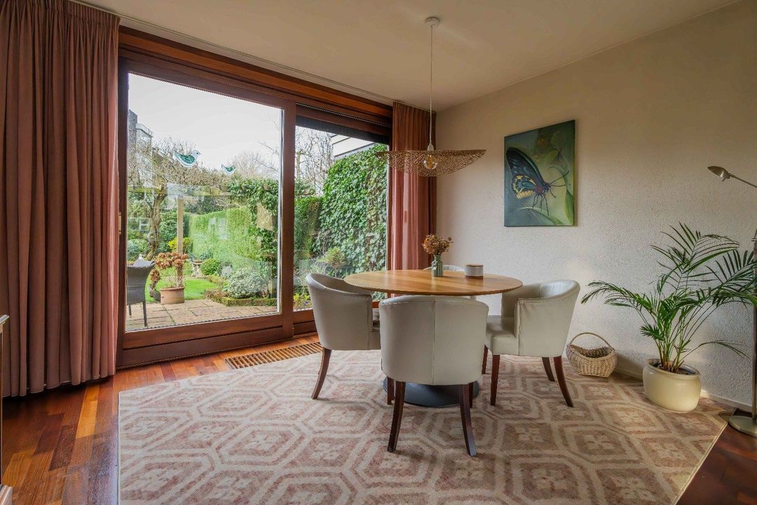 Aan de achterzijde vindt u de keuken met een mooie hoekopstelling, voorzien van inbouwapparatuur. Via de schuifpui en een extra schuifdeur heeft u direct toegang tot de tuin – ideaal voor binnen-buitenleven. Vanuit de eethoek kijkt u prettig naar buiten en heeft u zicht op de tuin.