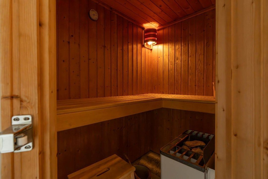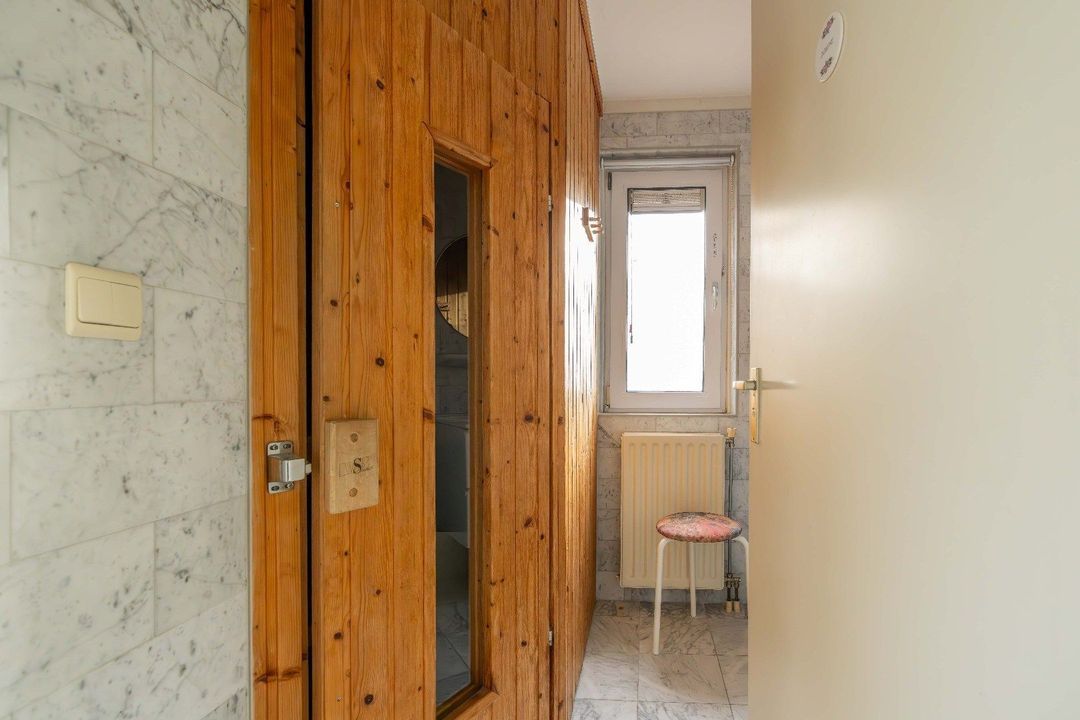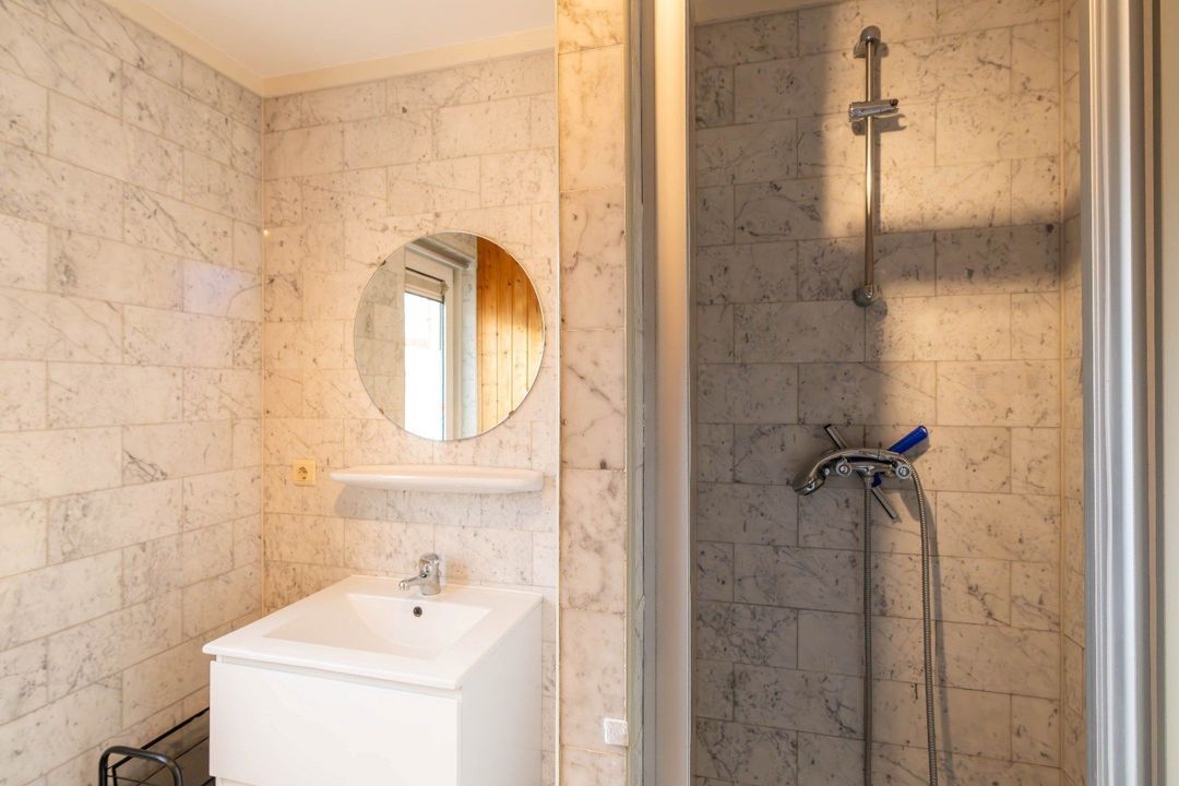 Beneden: douchecabine, badmeubel, radiator en sauna.