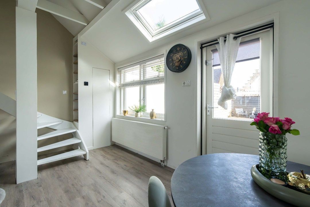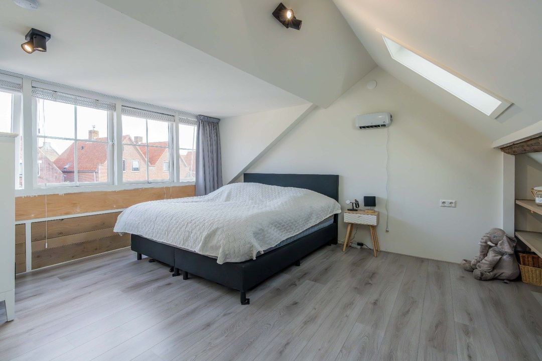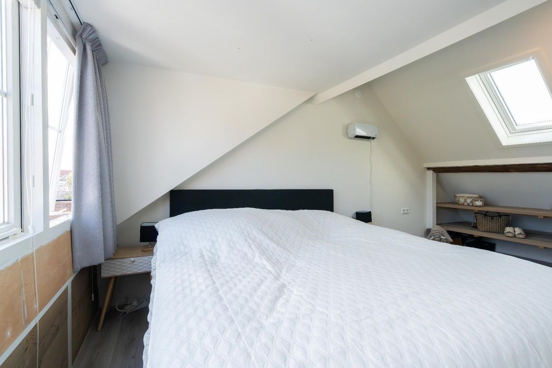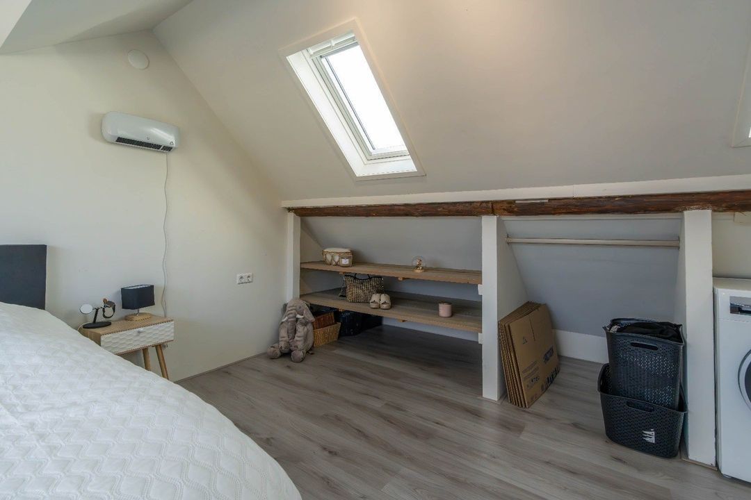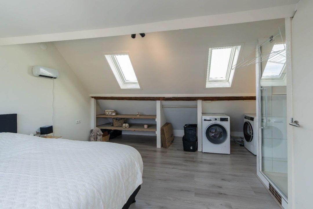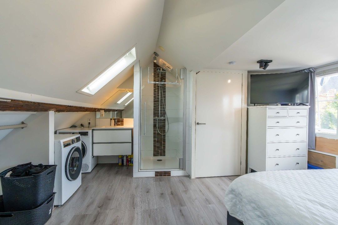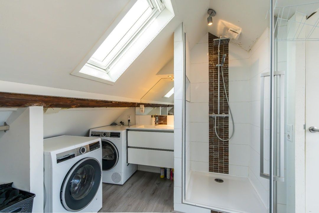 Op de verdieping vind je een royale slaapkamer met een doucheruimte, wastafel en aansluitingen voor witgoed. Dankzij de dakkapel geniet je hier van extra ruimte en veel natuurlijk licht.